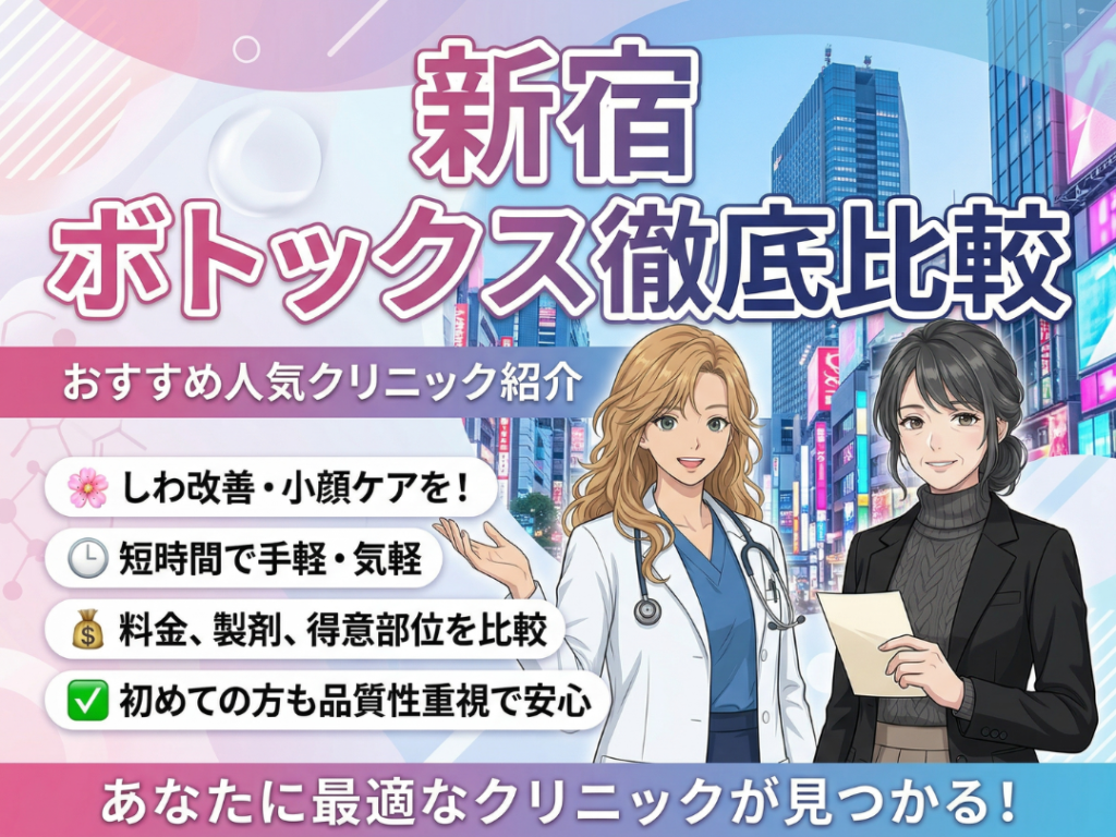 新宿でボトックス注射を受けたいけれど、どのクリニックを選べばいいか迷っていませんか。 ボトックス注射は、メスを使わずにしわ改善や小顔ケアを目指せる人気の美容施術です。短時間で受けやすく、ダウンタイムも比較的少ないため、はじめての美容医療と...