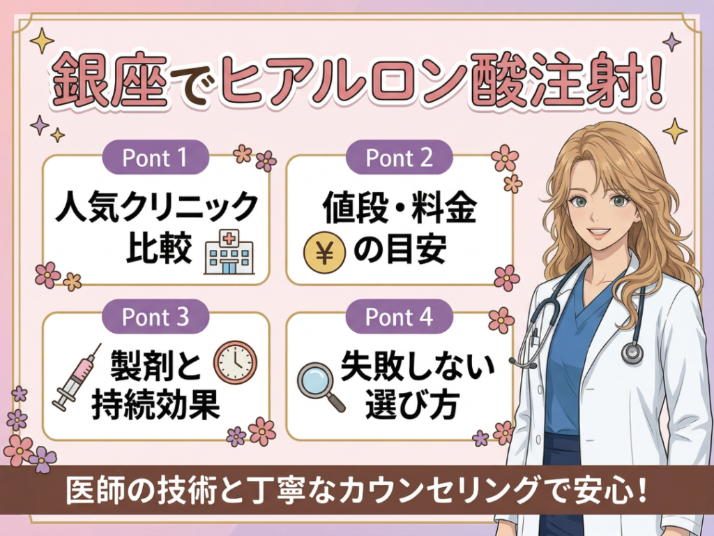 銀座でヒアルロン酸注射を受けたいけれど、 「どのクリニックを選べばいいの?」 「料金はどのくらいかかるの?」 と迷っている方も多いのではないでしょうか。 ヒアルロン酸注射は、メスを使わずにほうれい線やしわ、涙袋、唇、あごなどの印象を整えやす... -