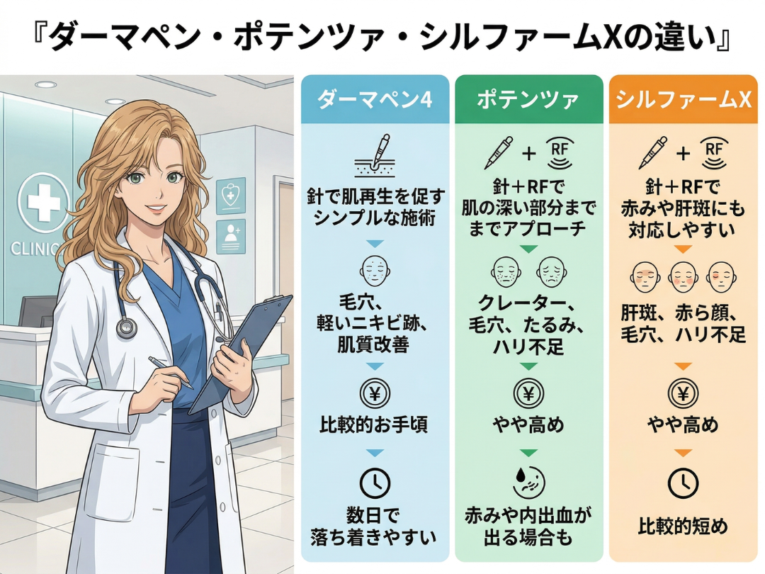 ダーマペン4、ポテンツァ、シルファームXは、どれも「マイクロニードル治療」に分類される人気の美肌施術です。ただし、仕組みや得意な悩み、ダウンタイムには違いがあります。