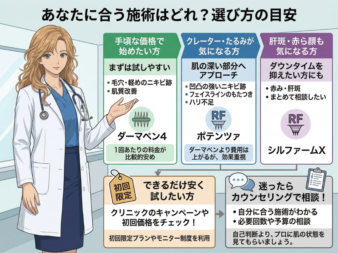どの施術が合うかは、肌悩みや予算、ダウンタイムの取りやすさによって変わります。選び方の目安をわかりやすくまとめると、次のとおりです。