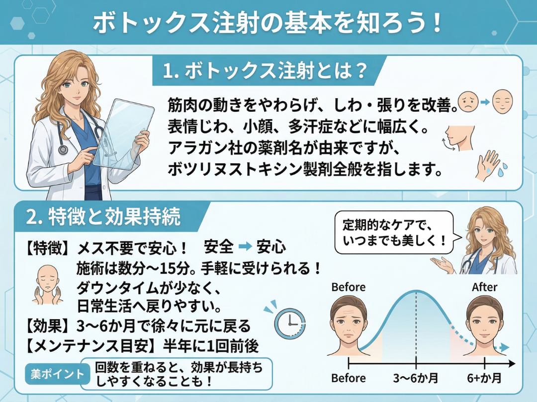 ボトックス注射は、メスを使わずにしわ改善や小顔ケアを目指せる人気の美容施術です。短時間で受けやすく、ダウンタイムも比較的少ないため、はじめての美容医療として選ばれることも少なくありません。