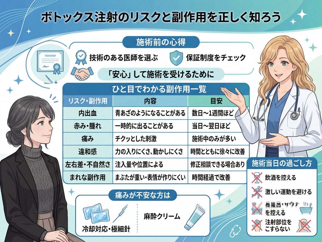 こうしたリスクを減らすには、症例数が多いクリニックや、希望をしっかり聞いてくれる医師を選ぶことが大切です。保証制度があるクリニックなら、万が一のときも相談しやすいです。